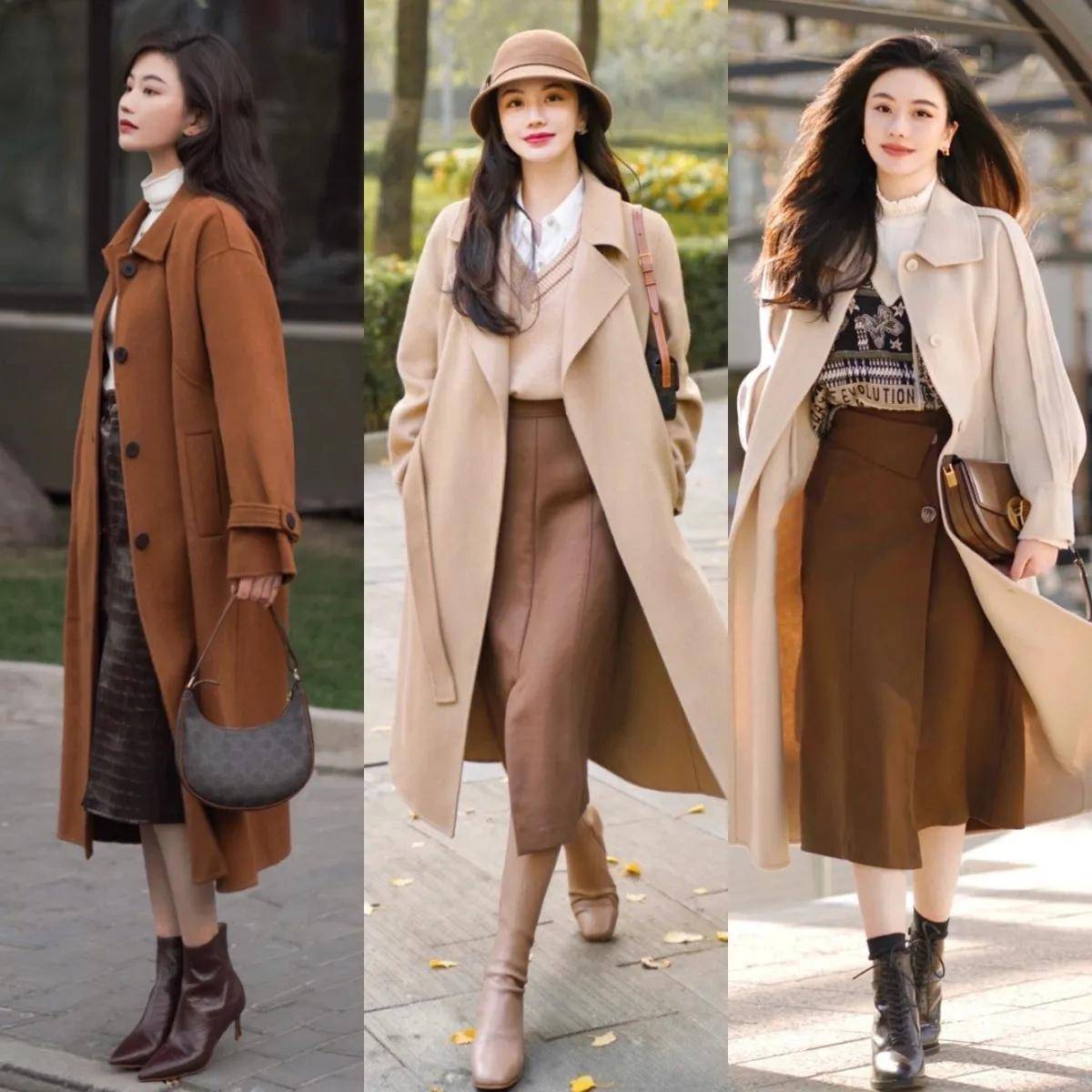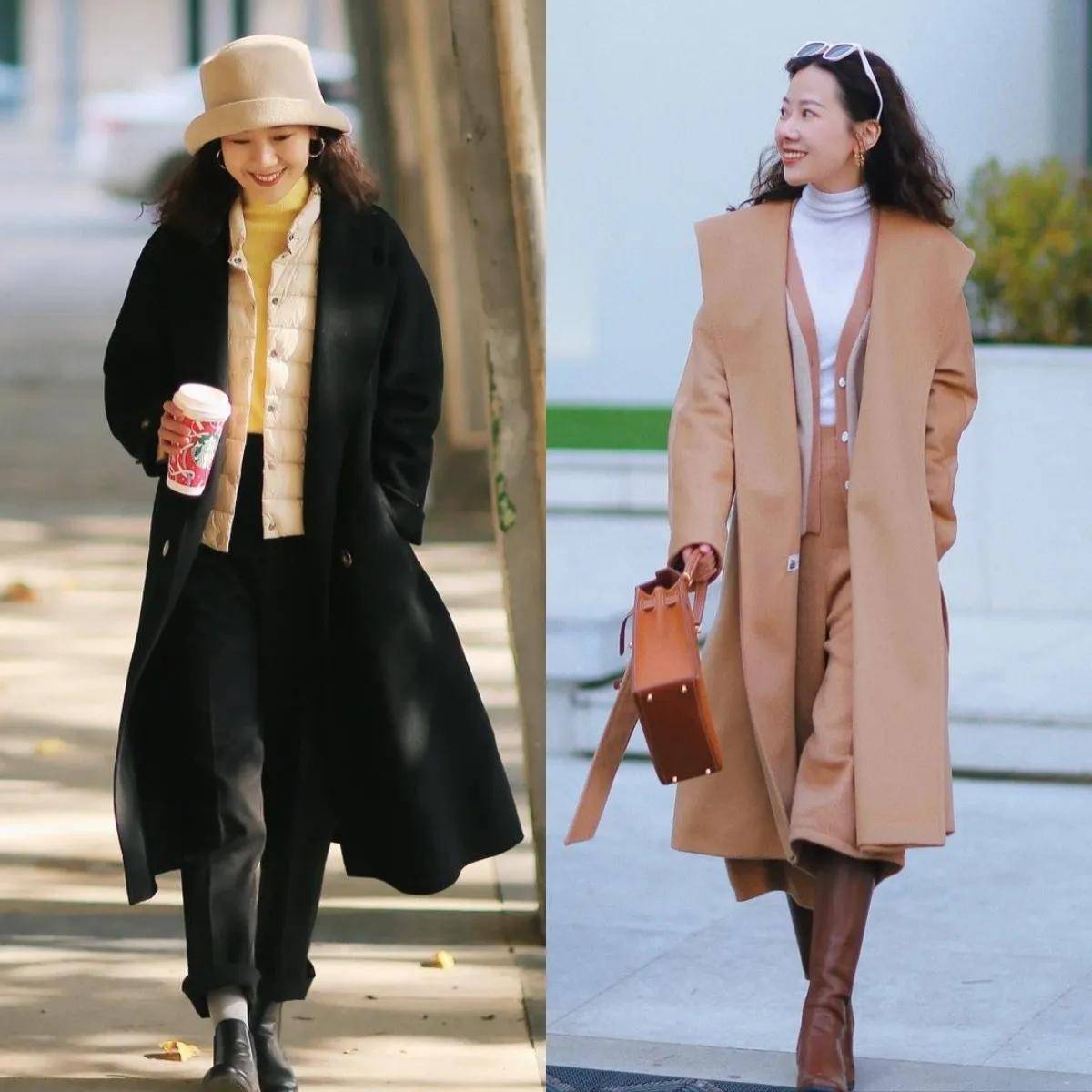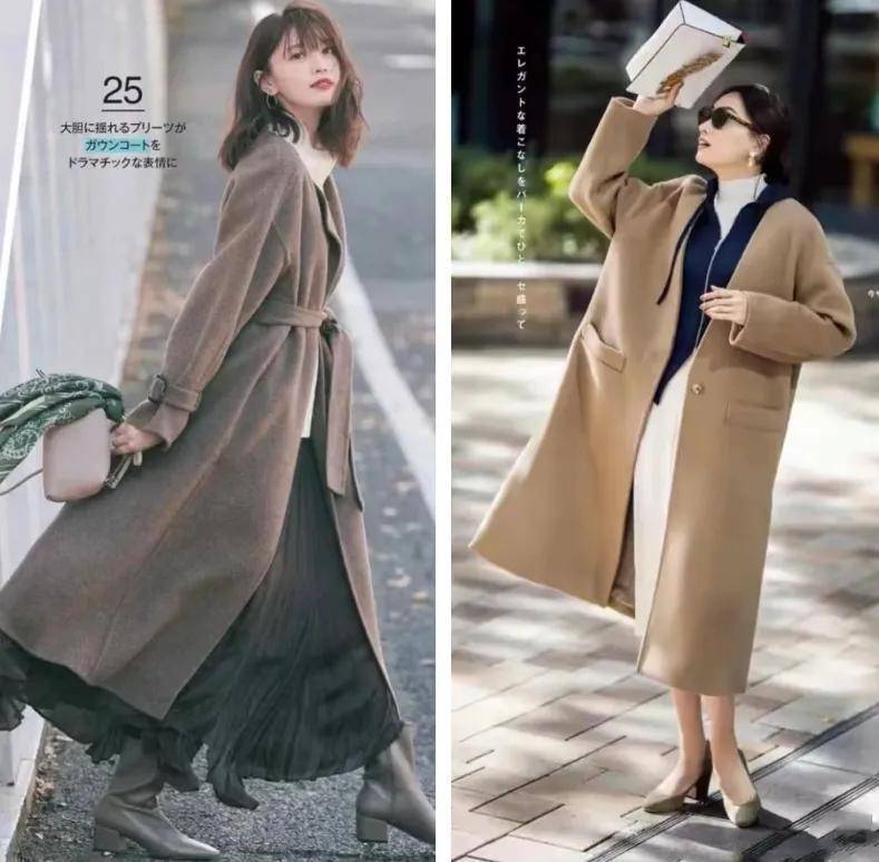 推荐选择右边的这一件棕色的大衣外套,内搭一套西服裙装,叠穿黑色针织打底衫,脚上穿的黑色的高温单鞋,这样的衣服造型搭配反而更时髦,保暖舒适。去公司上班的时候有空调,可以把你的大衣外套脱了,挂在衣橱里面,或者是挂在你的工作椅上,下班的时候再穿,完全没有任何问题。