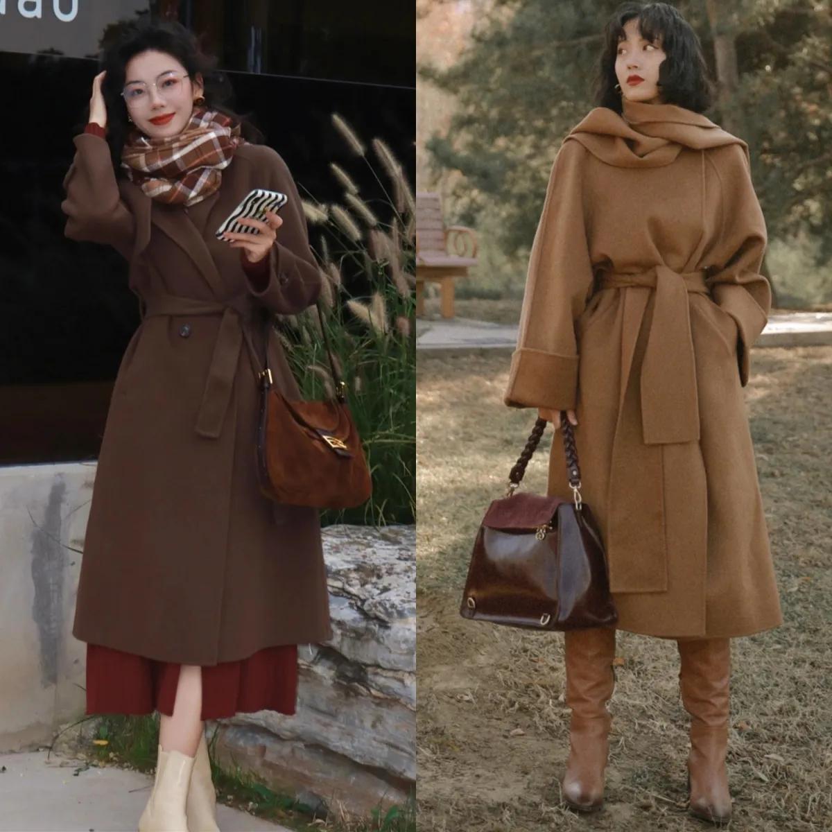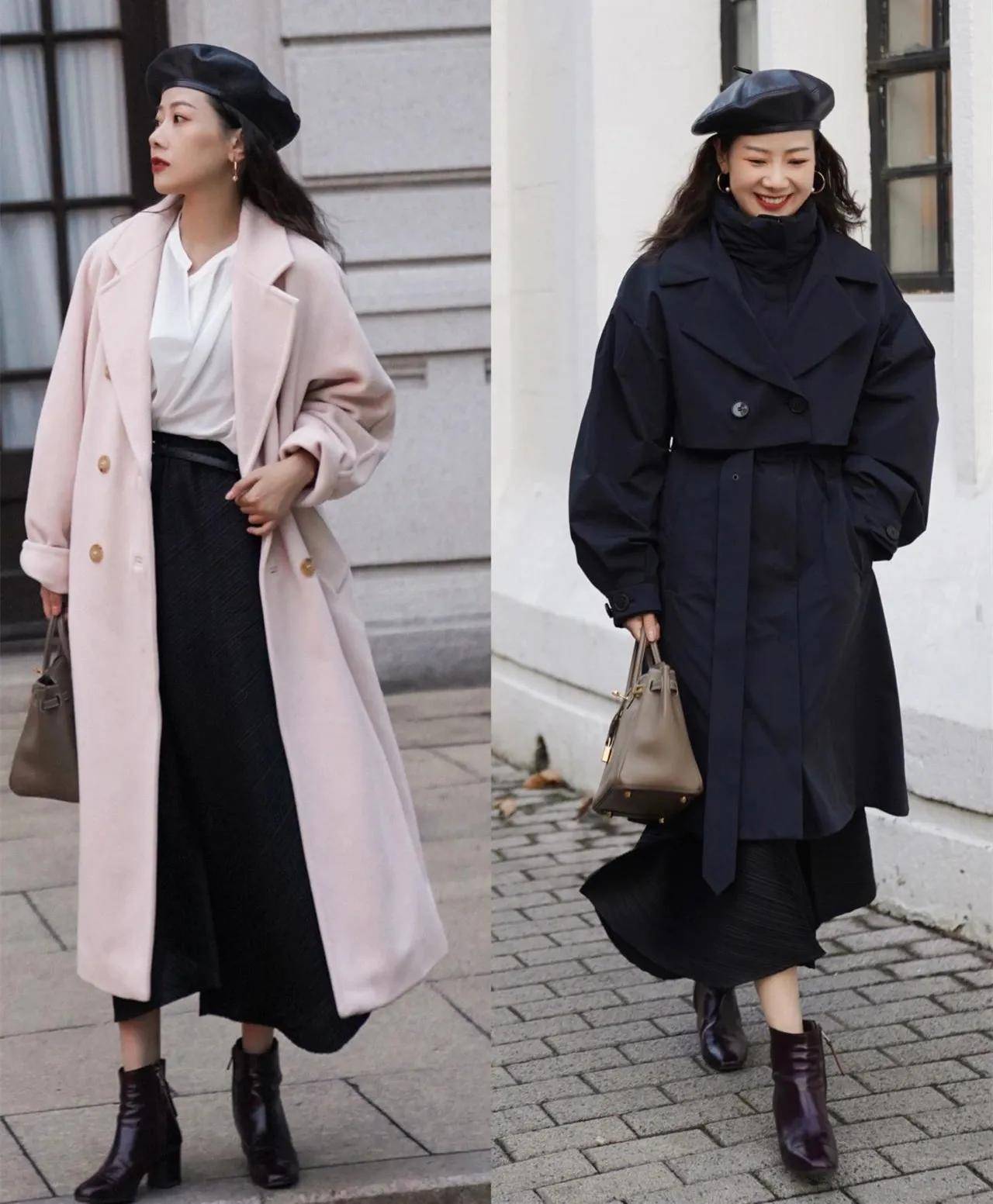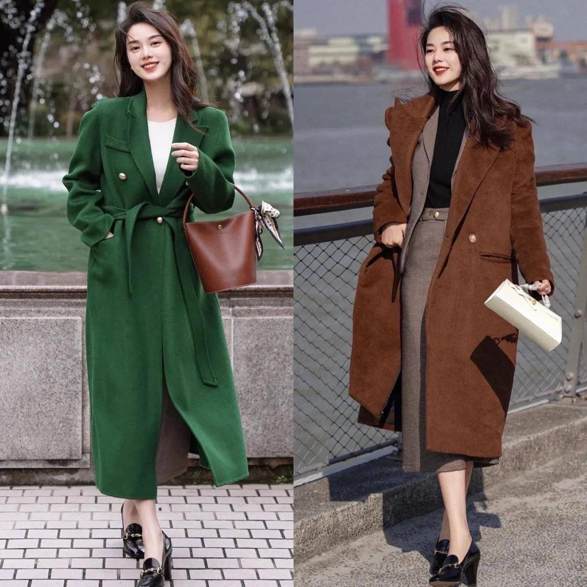 推荐选择右边的这一件棕色的大衣外套,内搭一套西服裙装,叠穿黑色针织打底衫,脚上穿的黑色的高温单鞋,这样的衣服造型搭配反而更时髦,保暖舒适。去公司上班的时候有空调,可以把你的大衣外套脱了,挂在衣橱里面,或者是挂在你的工作椅上,下班的时候再穿,完全没有任何问题。