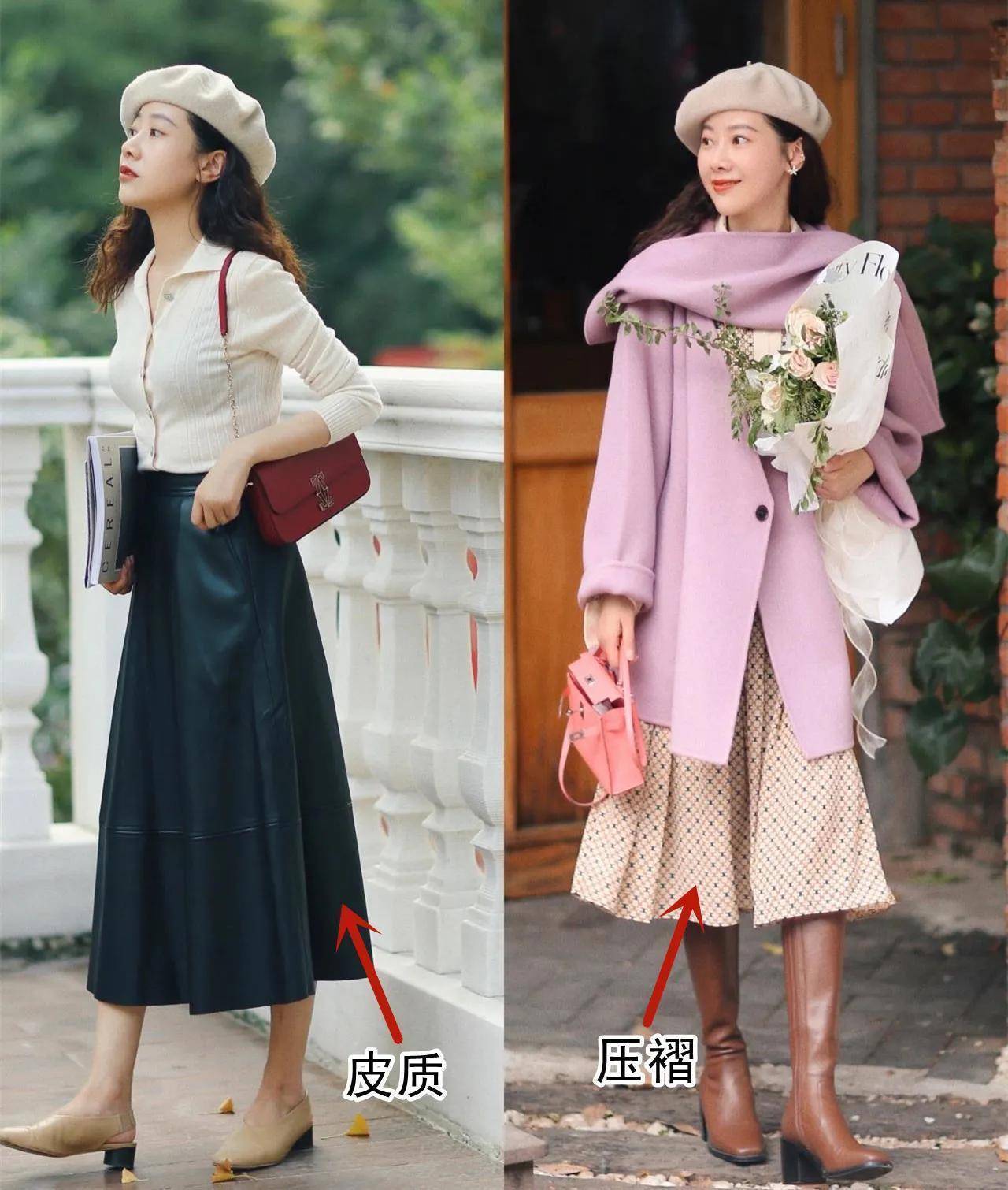 换成波点的压褶半身裙来搭配上中筒靴,整体造型虽然也好看,但是失去了那种高贵感觉。